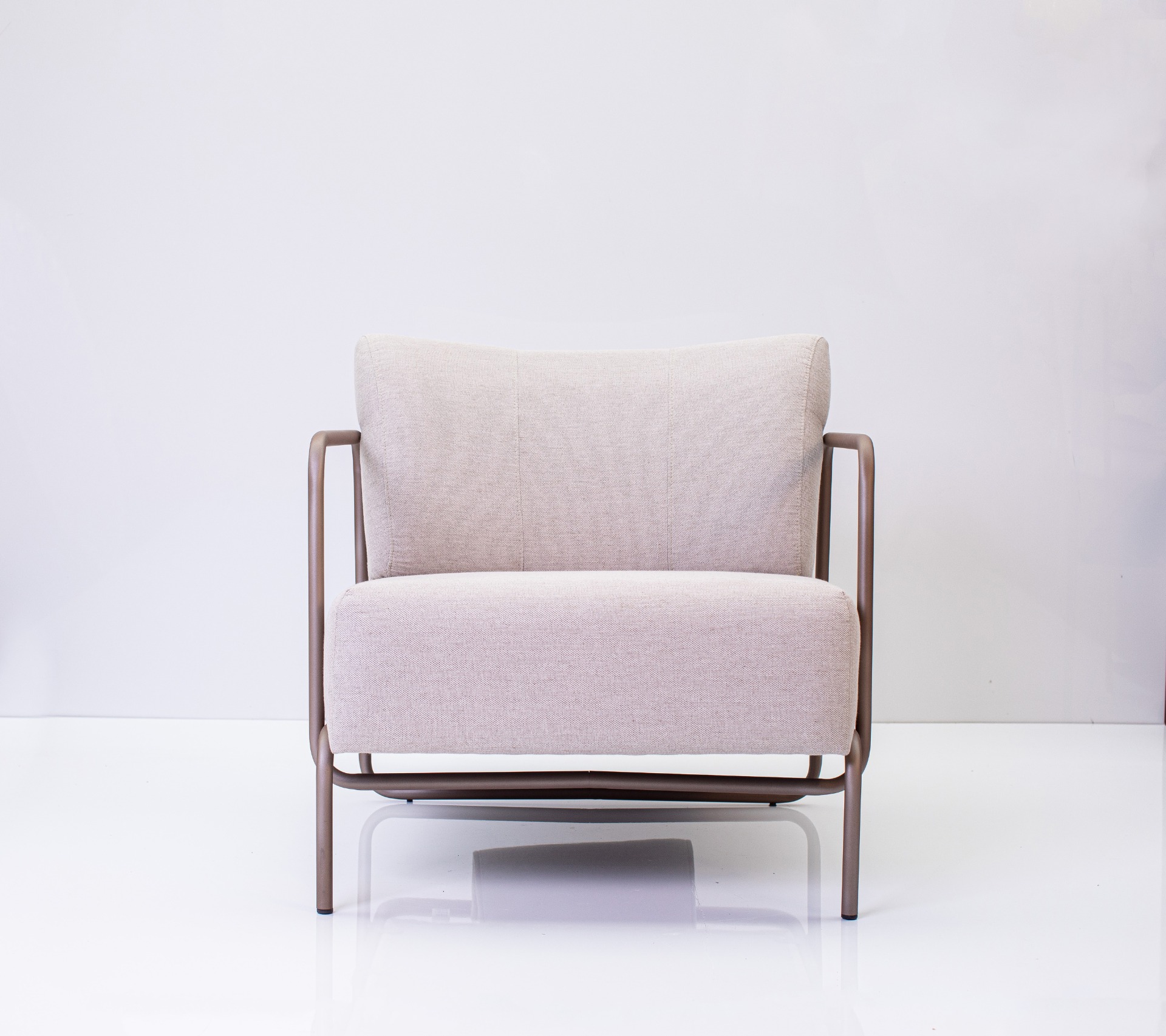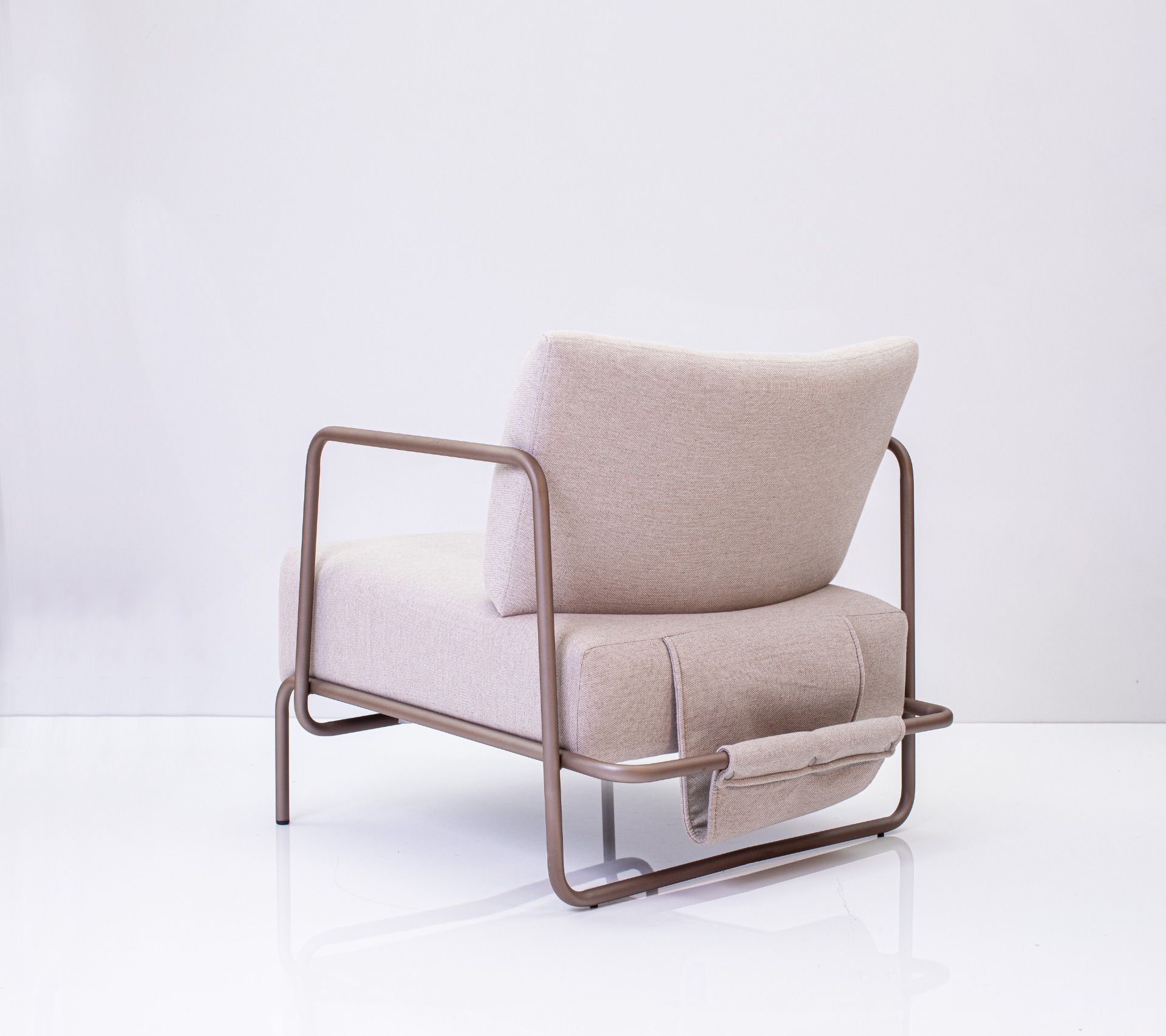 Descrição: Poltrona com base fixa, estrutura em metal com acabamento estofado em tecido.
